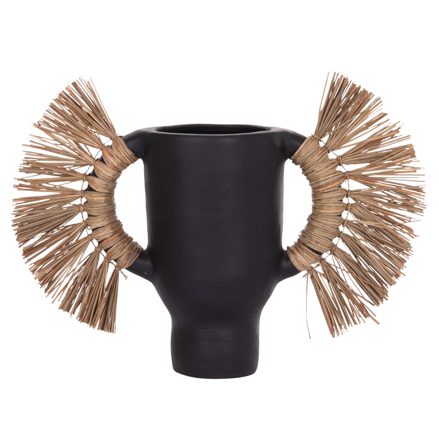 Το επιτραπέζιο χειροποίητο διακοσμητικό βάζο ALICA είναι ένα πολύ ιδιαίτερο διακοσμητικό στοιχείο για κάθε χώρο. Είναι κατασκευασμένο εξολοκλήρου από τερακότα σε ΜΑΥΡΟ χρώμα, ενώ διαθέτει και δύο χερούλια επενδυμένα με αποξηραμένο grass, και ένα φαρδύ στόμιο.