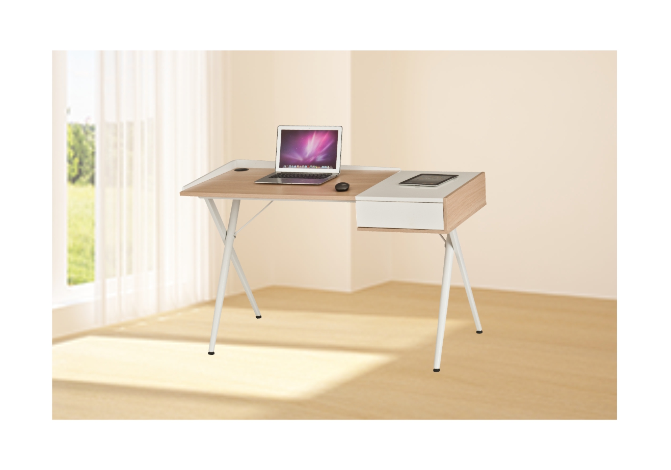 Ο σκελετός του, σε λαμπερό λευκό χρώμα, προσδίδει μια αίσθηση φρεσκάδας και φωτεινότητας. Η επιφάνεια εργασίας, με επένδυση πραγματικής μελαμίνης σε ρεαλιστικό μοτίβο και απόχρωση δρυός, προσφέρει ζεστή και φυσική ατμόσφαιρα, ανθεκτικότητα και ευκολία στον καθαρισμό.