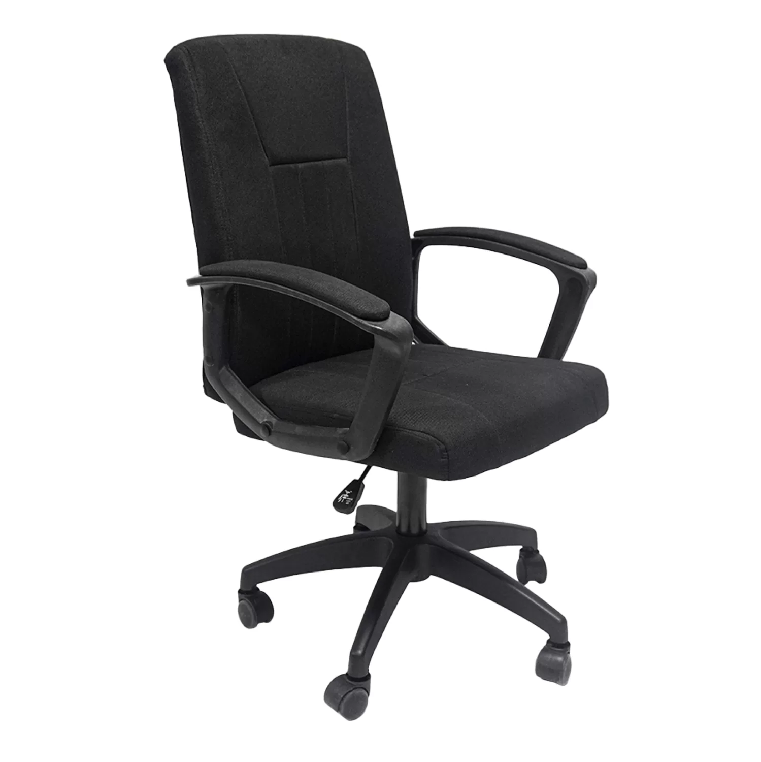 Το κάθισμα και η πλάτη είναι επενδεδυμένα με μαλακό αφρώδες υλικό και εξαιρετικό μαύρο ύφασμα για μέγιστη άνεση. Ο σκελετός, τα σταθερά μπράτσα, η βάση 5-νυχη και τα ροδάκια 50mm είναι κατασκευασμένα από ανθεκτικό nylon σε μαύρο χρώμα, διασφαλίζοντας μακροχρόνια αντοχή. Η καρέκλα διαθέτει ρύθμιση ύψους και ανάκλισης μέσω εύχρηστου μοχλού, ενώ η ανάρτηση Class 2 προσφέρει σταθερότητα και υποστηρίζει έως και 120 κιλά.