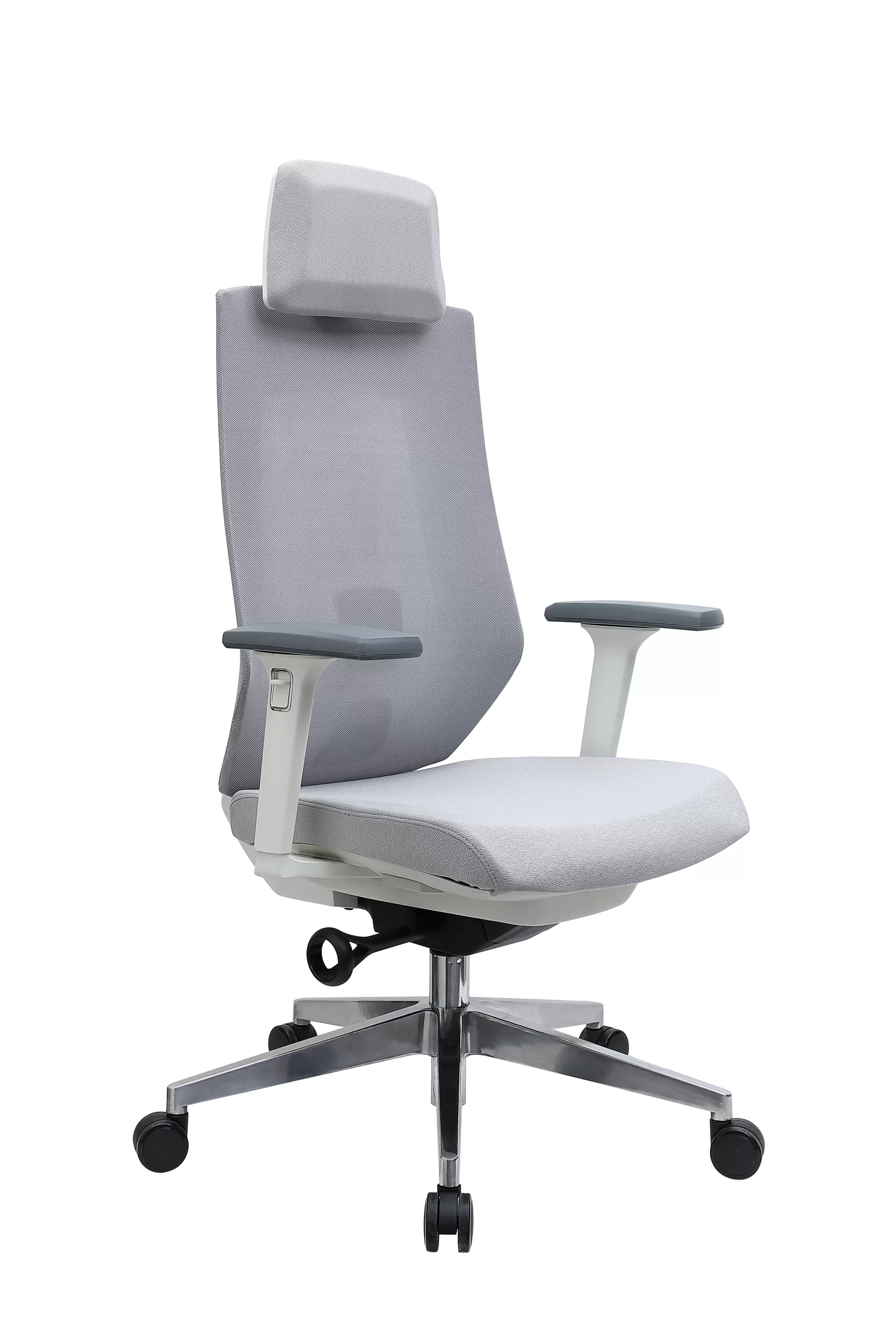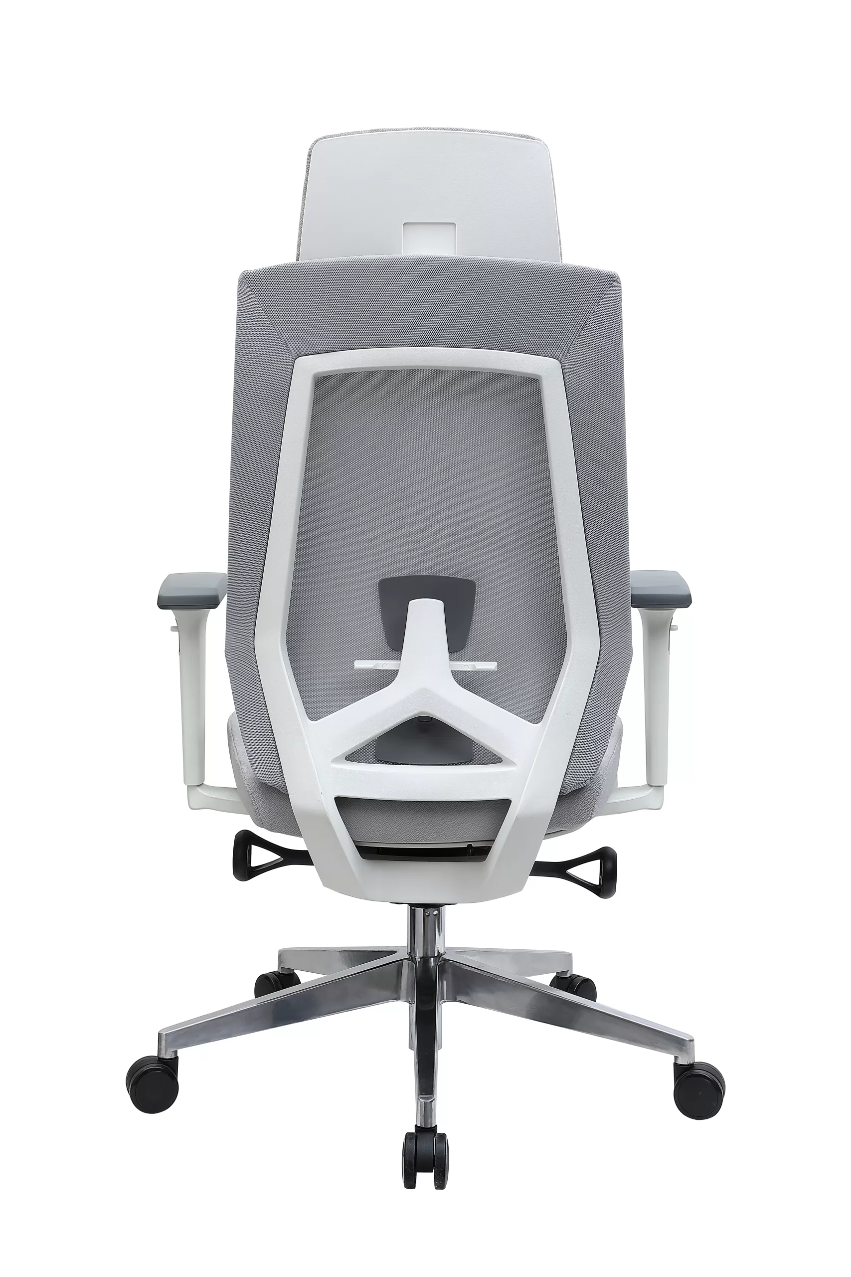 Ο λευκός σκελετός από αλουμίνιο και η χρωμίου βάση εγγυώνται αντοχή και σταθερότητα, ενώ το λευκό τεχνόδερμα υψηλής ποιότητας προσδίδει μια αίσθηση νεωτερικότητας και καθαρότητας. Η ψηλή πλάτη με ρυθμιζόμενο προσκεφάλι και οι μπράτσες εξασφαλίζουν πλήρη ελευθερία κινήσεων και βελτιωμένη στήριξη της μέσης και της σπονδυλικής στήλης κατά τις πολλές ώρες καθίσματος.