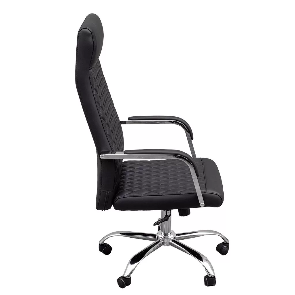Πολυθρόνα γραφείου διευθυντή κατασκευασμένη από σταθερό μεταλλικό σκελετό σε ασημί χρώμα επενδυμένο με τεχνόδερμα ανάγλυφο εξαιρετικής ποιότητας και αντοχής στη φθορά και στο χρόνο σε μαυρο χρώμα. Διαθέτει μεταλλικά μπράτσα και βάση χρωμίου για μεγαλύτερη αντοχή. Ιδανική και πρακτική επιλογή που θα ανανεώσει τη διακόσμηση του χώρου που θα την τοποθετήσετε και θα προσφέρει άνεση και χαλάρωση.