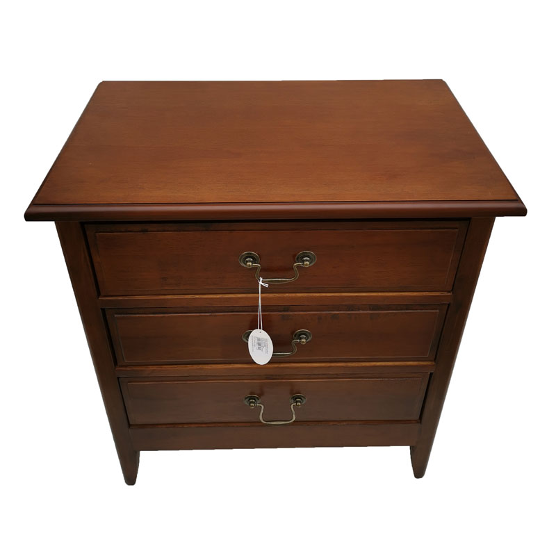 Βοηθητικό έπιπλο – κομοδίνο με 3 συρτάρια κατασκευασμένο από μασίφ ξύλινο σκελετό σημύδας υψηλής ποιότητας και ανθεκτικότητας, σε χρώμα καρυδί. Μία vintage επιλογή για να διακοσμήσετε το χώρο σας.