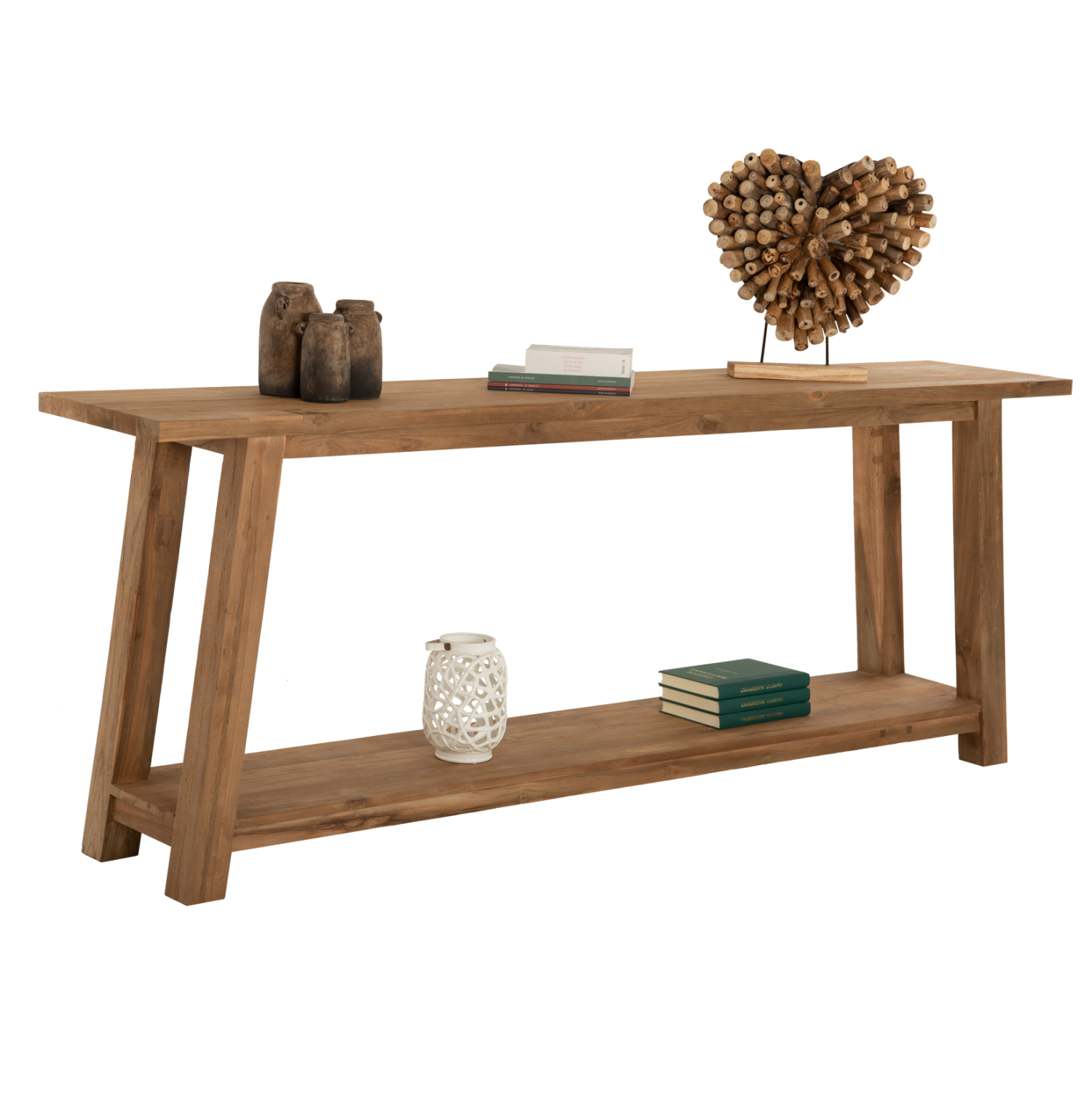 —Κονσόλα από ξύλο ΤΕΑΚ σε κανονικό μακρόστενο ορθογώνιο σχήμα επιφάνειας. Στηρίζεται σε 4 πόδια και διαθέτει άλλη μια παρόμοια επιφάνεια στο κάτω μέρος. Το ΦΥΣΙΚΟ χρώμα όλου του επίπλου προσδίδει μια ακαταμάχητη εικόνα που θα αποτελέσει το σημείο αναφοράς οπουδήποτε κι αν τοποθετηθεί η κονσόλα! Αποτελεί την επιτομή της ρουστίκ διακόσμησης σε λιτή κι απέριττη υλοποίηση, για τον χώρο που επιθυμείτε. Τι είναι όμως η κονσόλα; Η κονσόλα είναι ένα κομψό, γραφικό, συμπαγές έπιπλο που μπορεί να τοποθετηθεί σε σχεδόν οποιοδήποτε δωμάτιο- κουζίνα, διάδρομο, κρεβατοκάμαρα, παιδικό δωμάτιο, σαλόνι, dressing room, γραφείο, ακόμα και στο μπάνιο. Με αυτό, ο σχεδιασμός του χώρου γίνεται εκλεπτυσμένος, κομψός, πλήρως σκεπτόμενος. Η κονσόλα στο εσωτερικό χρησιμοποιείται τόσο ως μέρος ενός σετ με πολλά στοιχεία, όσο και ανεξάρτητα και επιλέγεται για τον γενικό σχεδιασμό του δωματίου.