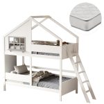 Η παιδική κουκέτα COMBO σε διάσταση για στρώματα 90×190εκ, είναι κατασκευασμένη από ξύλο πεύκου σε ΛΕΥΚΟ χρώμα. Η κουκέτα που έχει σχήμα σπιτιού με παράθυρο διαθέτει περιμετρικά κάγκελα και πλαϊνή σκάλα πρόσβασης στο επάνω κρεβάτι, ενώ τα στρώματα τοποθετούνται σε τάβλες από κόντρα-πλακέ ξυλεία.