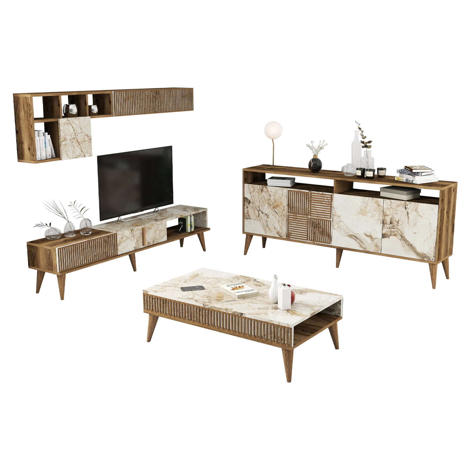 Η σύνθεση αποτελείται από έναν εντυπωσιακό συνδυασμό επίπλων για την τηλεόρασή σας, που περιλαμβάνει μια μονάδα δαπέδου και δύο επιτοίχια ράφια, ένα πρακτικό τραπεζάκι σαλονιού και έναν χώρο αποθήκευσης με μπουφέ. Όλα τα έπιπλα ανήκουν στην ίδια σειρά, με έναν εκλεπτυσμένο συνδυασμό χρωμάτων: η ζεστή απόχρωση του καρυδιού συναντά τη φωτεινότητα και τη μοναδική υφή του λευκού μαρμάρου, δημιουργώντας έναν πολυτελή και ζεστό χώρο.
