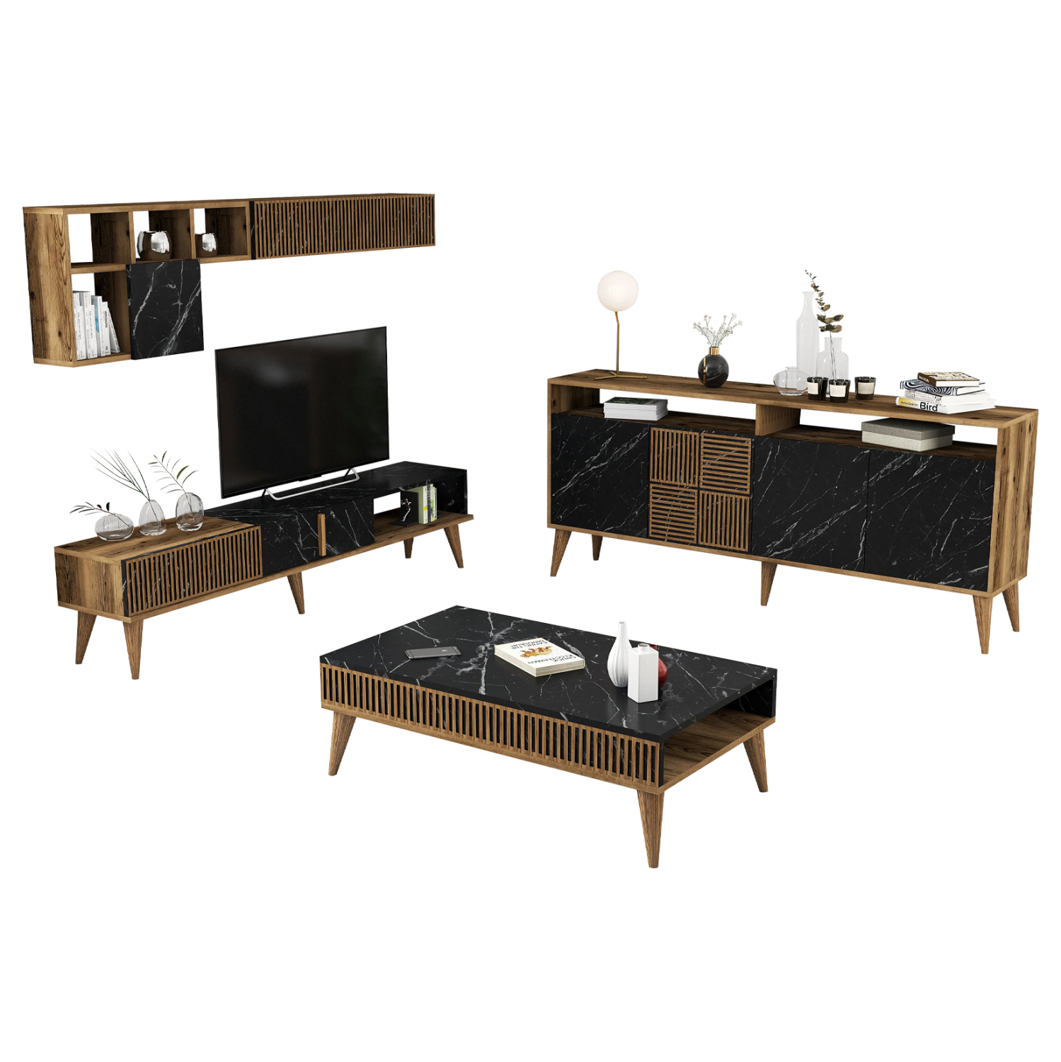 Η σύνθεση περιλαμβάνει έναν εντυπωσιακό συνδυασμό επίπλων για την τηλεόρασή σας, με μονάδα δαπέδου και επιτοίχια ράφια, ένα πρακτικό τραπεζάκι σαλονιού και έναν χώρο αποθήκευσης με μπουφέ. Όλα τα τεμάχια ανήκουν στην ίδια σειρά, με τα δύο κυρίαρχα χρώματα, το ζεστό καρύδι και το δραματικό μαύρο μάρμαρο, να συνδυάζονται τέλεια για ένα αποτέλεσμα υψηλής αισθητικής.