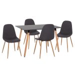 Το σετ περιλαμβάνει ένα ορθογώνιο τραπέζι και τέσσερις καρέκλες. Η επιφάνεια του τραπεζιού είναι κατασκευασμένη από MDF σε βαθύ μαύρο χρώμα, που εναρμονίζεται τέλεια με τον σκελετό από φυσικό ξύλο οξιάς. Οι καρέκλες έχουν άνετα καθίσματα επενδεδυμένα με ανθεκτικό ύφασμα σε σκούρο γκρι χρώμα και σταθερά μεταλλικά πόδια σε απόχρωση φυσικού ξύλου.