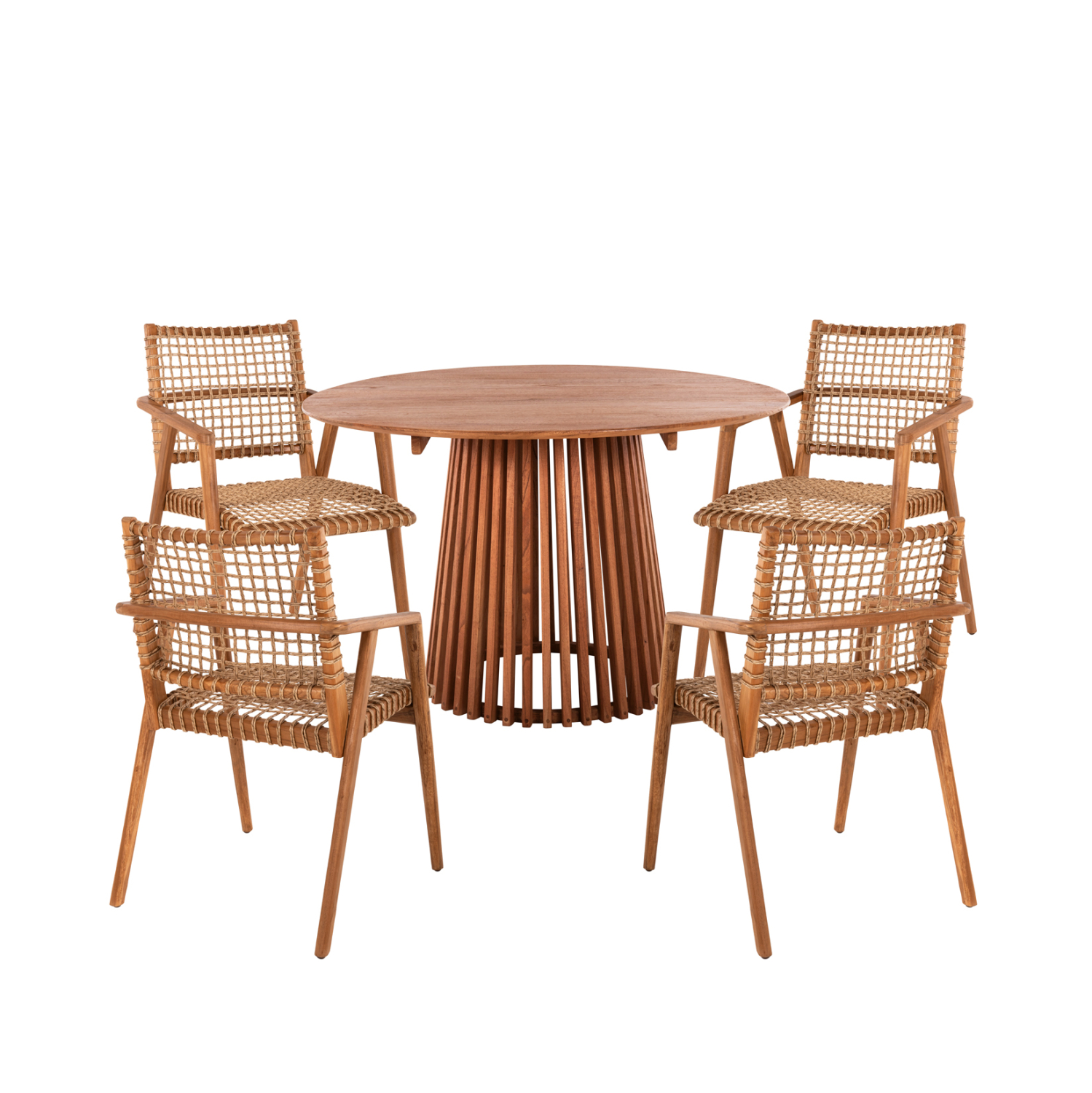 Αυτό το σετ τραπεζαρίας εσωτερικού χώρου 5τμχ αποτελείται από ένα στρογγυλό τραπέζι FRANTZ κατασκευασμένο εξολοκλήρου από ξύλο MINDI σε ΦΥΣΙΚΟ χρώμα, και από 4 καρέκλες τραπεζαρίας VAYA κατασκευασμένες από ξύλο teak και P.E. σχοινί σε ΦΥΣΙΚΟ χρώμα.