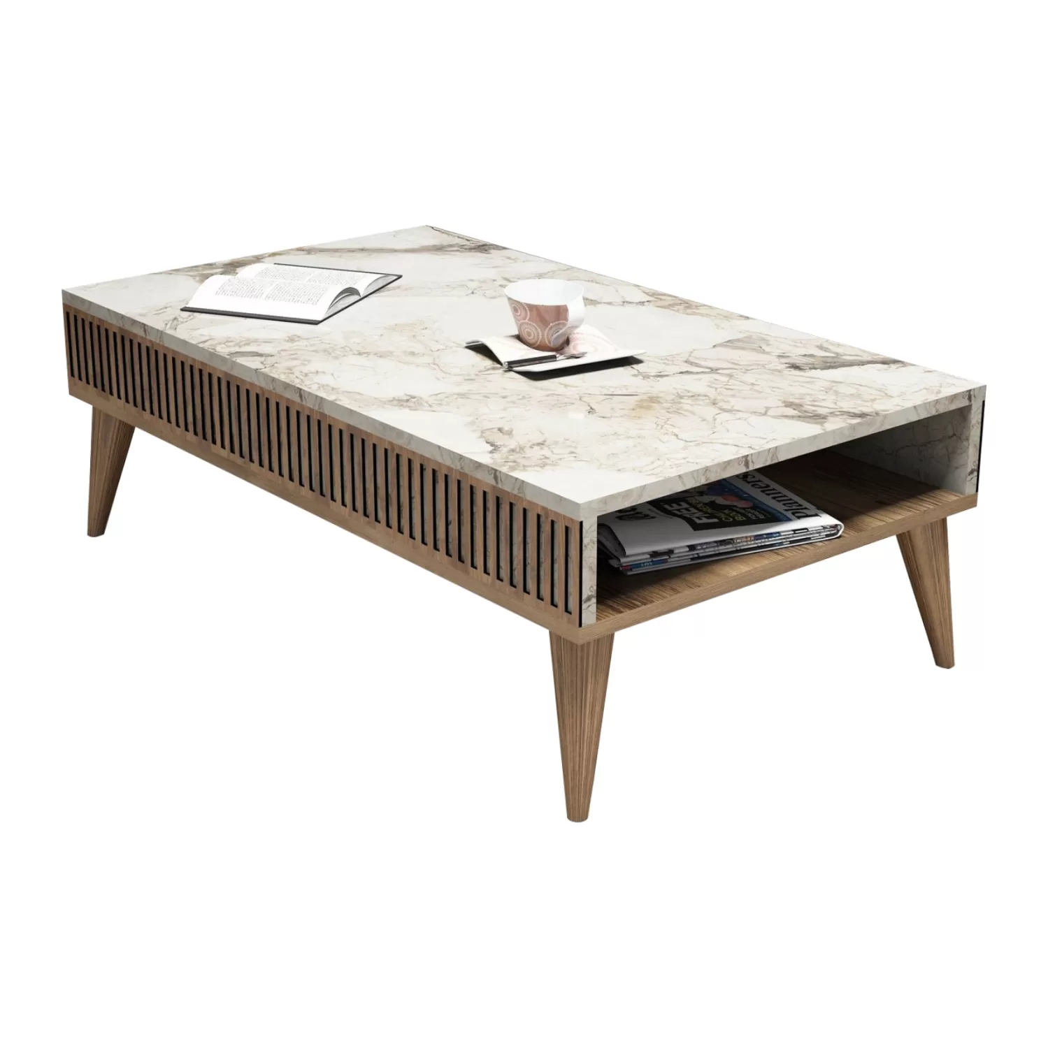 ΗΜ9505.03 τραπεζάκι σαλονιού—– Το τραπεζάκι αυτό είναι ένα όμορφο έπιπλο σε χρώμα καρυδί, ενώ η επιφάνεια και τα πλαϊνά έχουν όψη λευκού μαρμάρου. Το πρακτικό του design θα αλλάξει την εικόνα του σαλονιού ή του καθιστικού σας προς το καλύτερο. Πρόκειται για μια κατασκευή με μια ικανοποιητικού μεγέθους επάνω επιφάνεια. Από κάτω υπάρχει διαμπερής χώρος τοποθέτησης αντικειμένων με πρόσβαση μόνο από τις δύο πλευρές. Η κομψότητα, η ποιότητα και το minimal πρακτικό design χαρακτηρίζουν αυτό το τραπεζάκι, που έχει φτιαχτεί για εσένα.