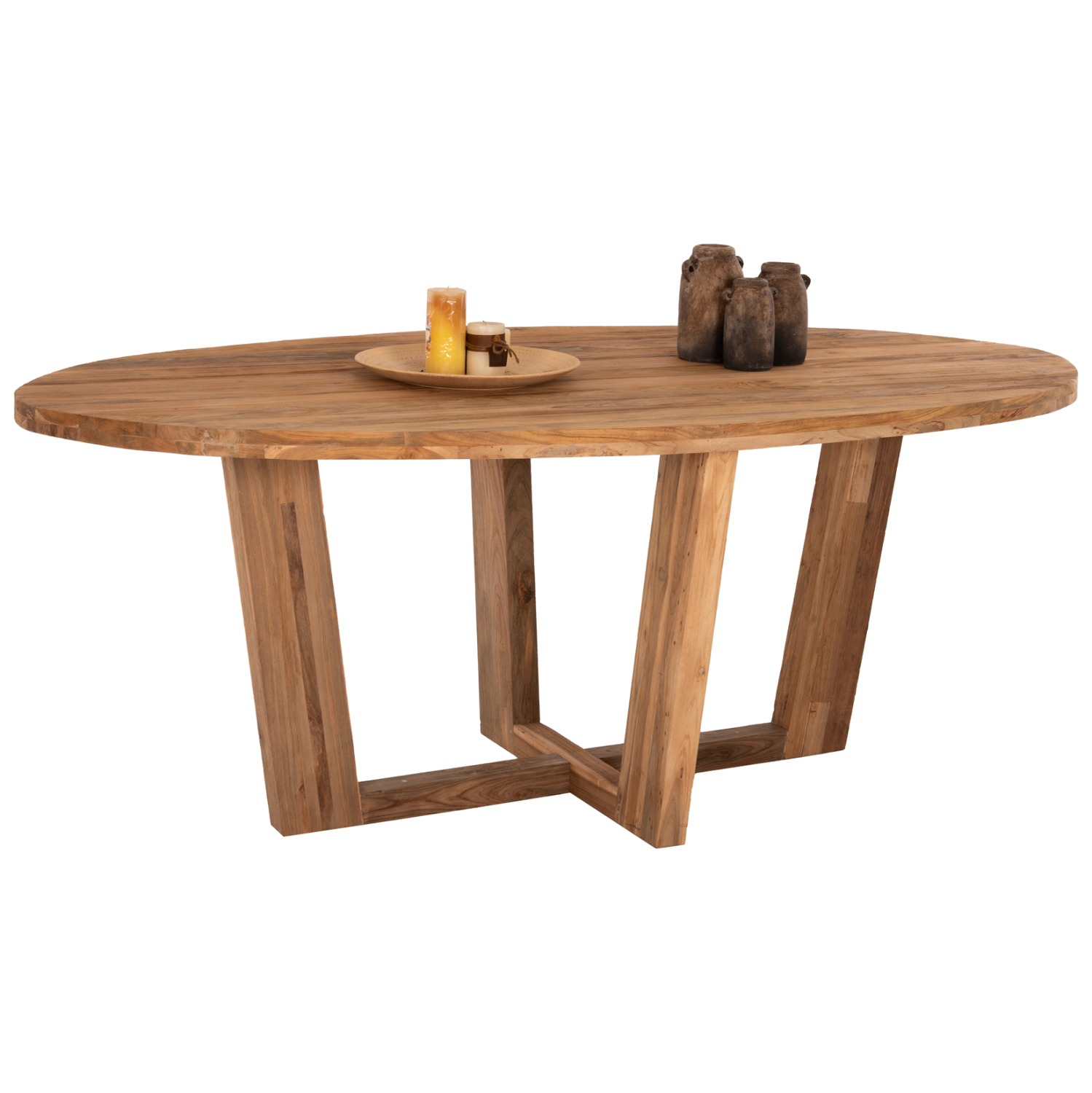 —Μεγάλο τραπέζι σε οβάλ σχήμα, κατασκευασμένο εξολοκλήρου από μασίφ ξύλα ΤΕΑΚ στο φυσικό τους χρώμα. Στηρίζεται σε μια χιαστί διάταξη ποδιών κατασκευασμένα από το ίδιο στιβαρό ξύλο. Ένα τραπέζι που θα ενθουσιάσει τους πάντες με το ικανοποιητικό μέγεθός του και την αντοχή του. Εσείς το μόνο που έχετε να κάνετε είναι να βρείτε τις καρέκλες που θα ταιριάξουν με αυτό το υπέροχο τραπέζι!