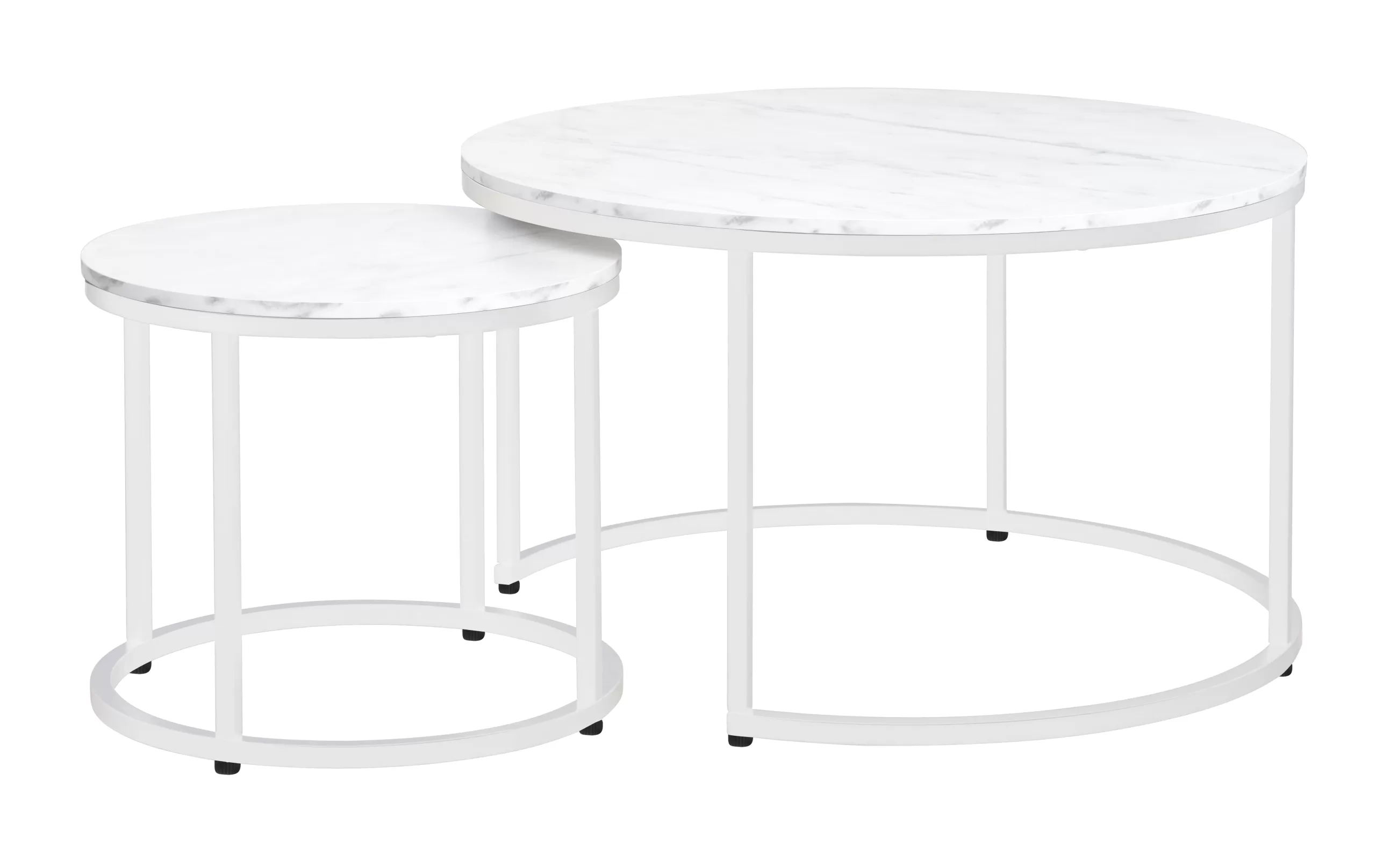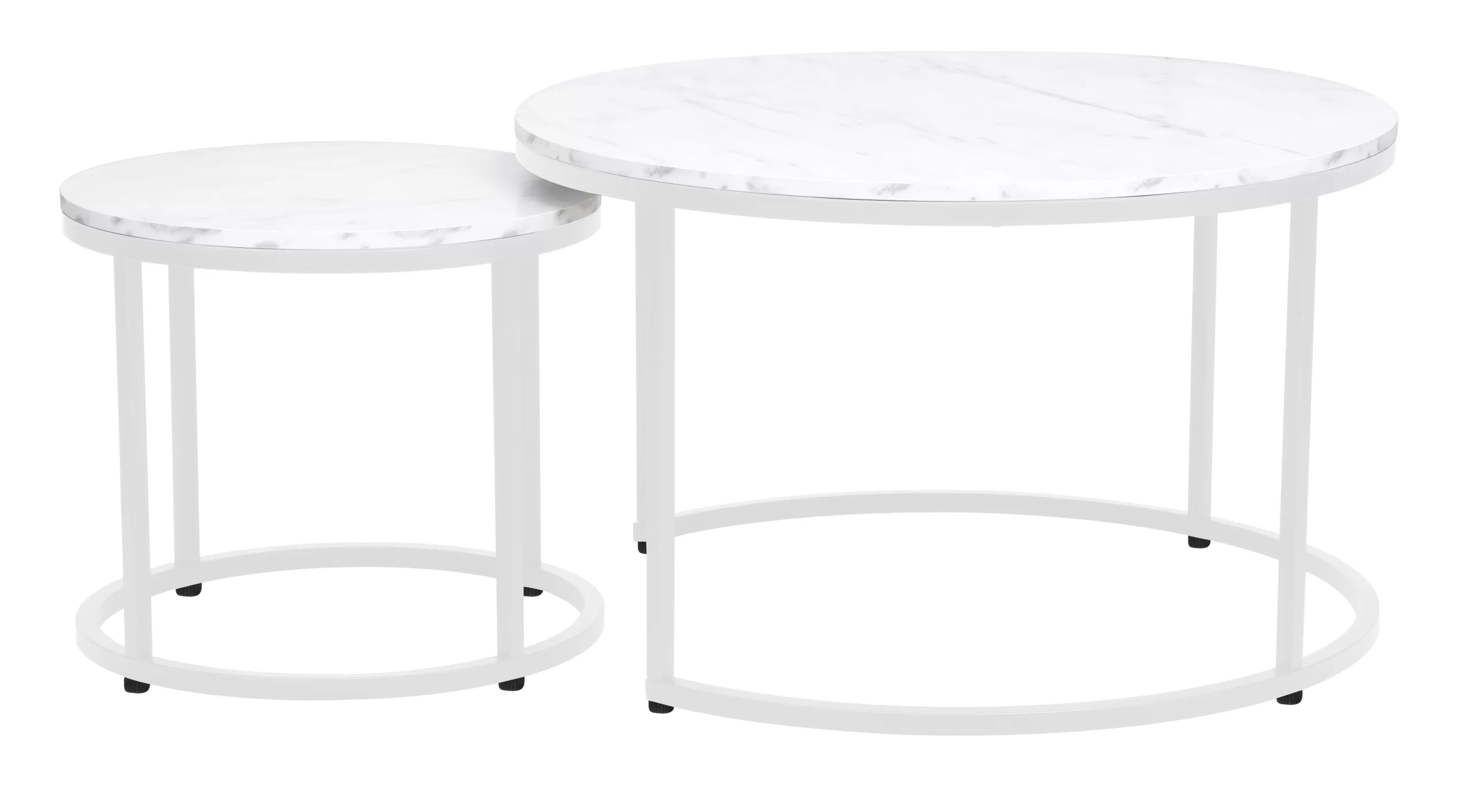 Το μεγάλο τραπέζι διαστάσεων 80×80 εκ. και ύψους 48 εκ. είναι ιδανικό για το κέντρο του δωματίου, ενώ το μικρότερο τραπέζι διαστάσεων 48×48 εκ. και ύψους 42 εκ. λειτουργεί τέλεια ως πλαϊνό. Η επιφάνεια είναι κατασκευασμένη από μοριοσανίδα με επένδυση μελαμίνης σε χρώμα λευκό-γκρι, απομίμησης μαρμάρου υψηλής αντοχής.