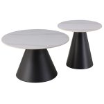 Το σετ 2 τραπεζιών RIDGE για το σαλόνι είναι η νεότερη προσθήκη στην γκάμα μας. Πρόκειται για 2 μεταλλικά τραπεζάκια στρογγυλά διαφορετικών μεγεθών με κωνική βάση σε ΜΑΥΡΟ χρώμα. Οι επιφάνειες είναι κεραμικές με όψη ΛΕΥΚΟΥ μαρμάρου. Ιδανικά τόσο για το σπίτι, όσο και για επαγγελματικούς χώρους.