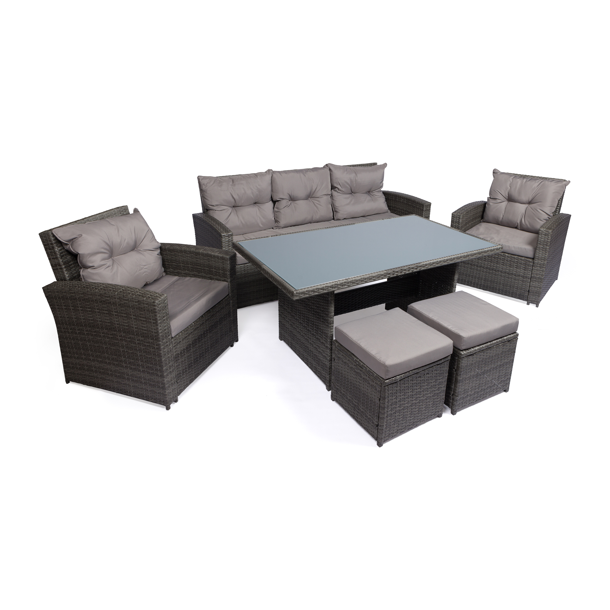 Το σετ αποτελείται από έναν καναπέ 3 θέσεων, δύο πολυθρόνες, δύο σκαμπό και ένα ευρύχωρο τραπέζι. Η κατασκευή τους είναι από ανθεκτικό μέταλλο με επένδυση από επίπεδο rattan (wicker) σε σύγχρονο χρώμα ανθρακί, που αντιστέκεται στις καιρικές συνθήκες. Τα μαξιλάρια είναι από αδιάβροχο ύφασμα 180gr σε γκρι απόχρωση, με πάχος 8εκ στο κάθισμα και 15εκ στην πλάτη για εξαιρετική άνεση.