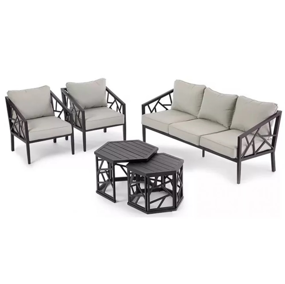 Σετ σαλονιού εξωτερικού χώρου που αποτελείται από έναν τριθέσιο καναπέ, δύο πολυθρόνες με γκρι μαξιλάρια και δύο τραπεζάκια. Το σετ είναι κατασκευασμένο από σκελετό χάλυβα με επιστρωση πούδρας και μαύρο φινίρισμα με μεγάλη διάρκεια ζωής για εποχιακή χρήση. Μία κομψή επιλογή για τον χώρο σας καθώς το design περιλαμβάνει περίπλοκους γεωμετρικούς βραχίονες και έντονες γωνίες αναδεικνύοντας έτσι κάθε υπαίθριο χώρο στον οποίο τοποθετείται. Επιπλέον τα μαξιλάρια είναι ντυμένα με μαλακό ύφασμα πολυεστέρα δημηιουργώντας μία αίσθηση χαλάρωσης.