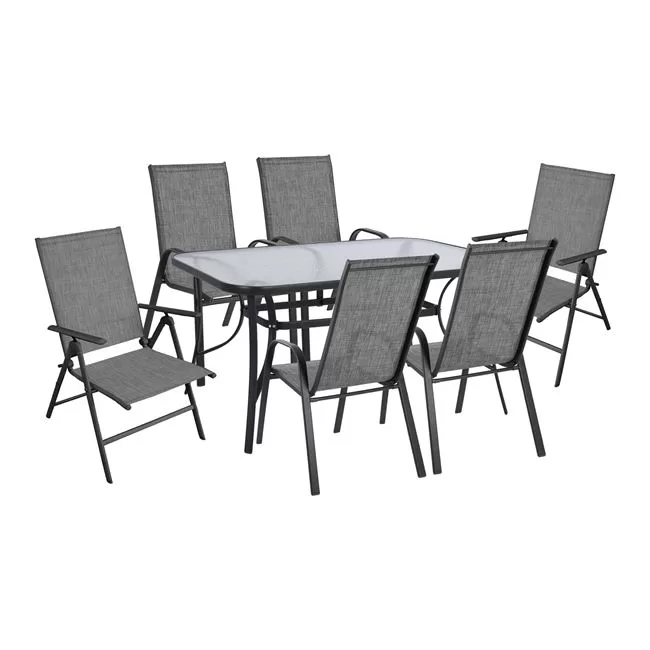 Το σετ περιλαμβάνει ένα εντυπωσιακό τραπέζι τραπεζαρίας BRUNO με μεταλλικό σκελετό και ενσωματωμένο γυαλί ασφαλείας tempered. Οι διαστάσεις του είναι 150x90x72 cm, με απόσταση ποδιών 136×80 cm. Συνοδεύεται από τέσσερις άνετες πολυθρόνες LEON και δύο πτυσσόμενες πολυθρόνες, όλες κατασκευασμένες από μεταλλικό σκελετό και επενδυμένες με το ανθεκτικό και εύπλυνο ύφασμα textilene στην ίδια γκρι απόχρωση.