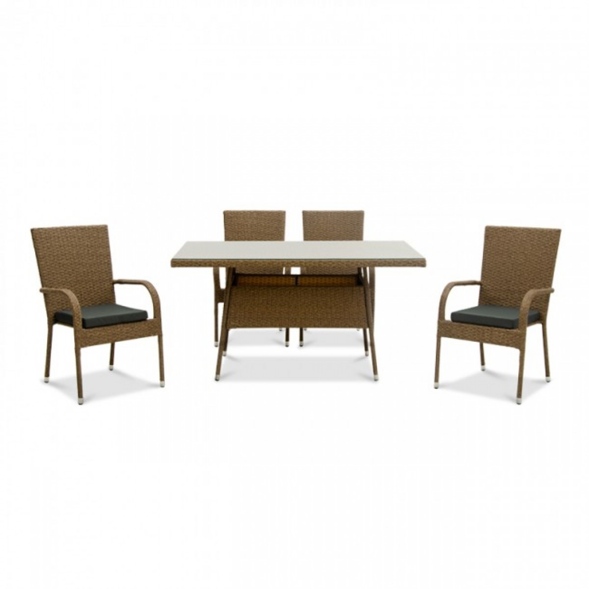 Σετ τραπεζαρίας με 4 πολυθρόνες και ένα τραπέζι. Ο σκελετός είναι μεταλλικός για να αντέχει σε φθορές και βάρος. Εξωτερικά διαθέτει πλέξη rattan-wicker εξαιρετικής ποιότητας σε καφέ χρώμα. Οι καρέκλες διαθέτουν μαξιλάρι καθίσματος 5εκ. με 180γρ. ύφασμα με ρέλι, φερμουάρ και κορδόνια στο πίσω μέρος για εύκολο καθάρισμα και μεγαλύτερη άνεση. Το τραπέζι και οι καρέκλες επίσης διαθέτουν, διακοσμητικό “δαχτυλίδι” από αλουμίνιο στα πόδια. Μία διαχρονική επιλογή που θα σας προσφέρει στιγμές χαλάρωσης και θα σας ανταμείψει με την πάροδο του χρόνου.