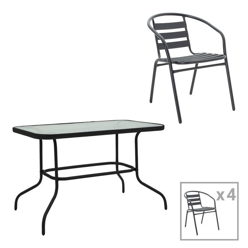 Το σετ περιλαμβάνει ένα τραπέζι και τέσσερις καρέκλες, έτοιμο να μετατρέψει την τραπεζαρία σου ή ακόμα και την καφετέρια σου. Οι διαστάσεις του τραπεζιού είναι 110x60x70 εκ, παρέχοντας άνετο χώρο για γεύματα με φίλους ή οικογενειακές συγκεντρώσεις. Η κατασκευή από μέταλλο εγγυάται μακροχρόνια αντοχή και σταθερότητα.