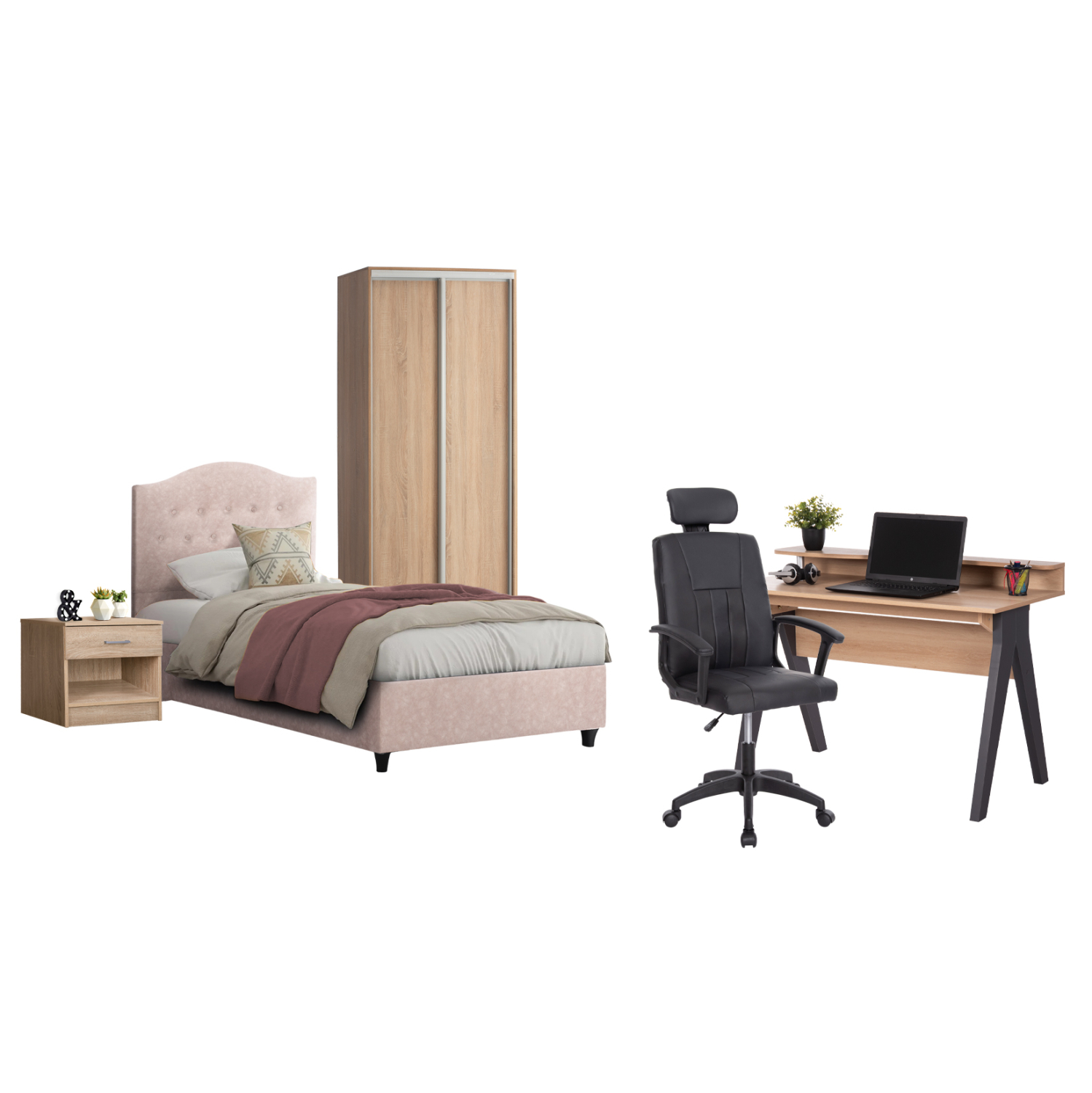 Αυτό το σετ περιλαμβάνει ένα κομοδίνο, ένα κρεβάτι, μια ντουλάπα, μια καρέκλα γραφείου, και ένα γραφείο! Αναλυτικά: