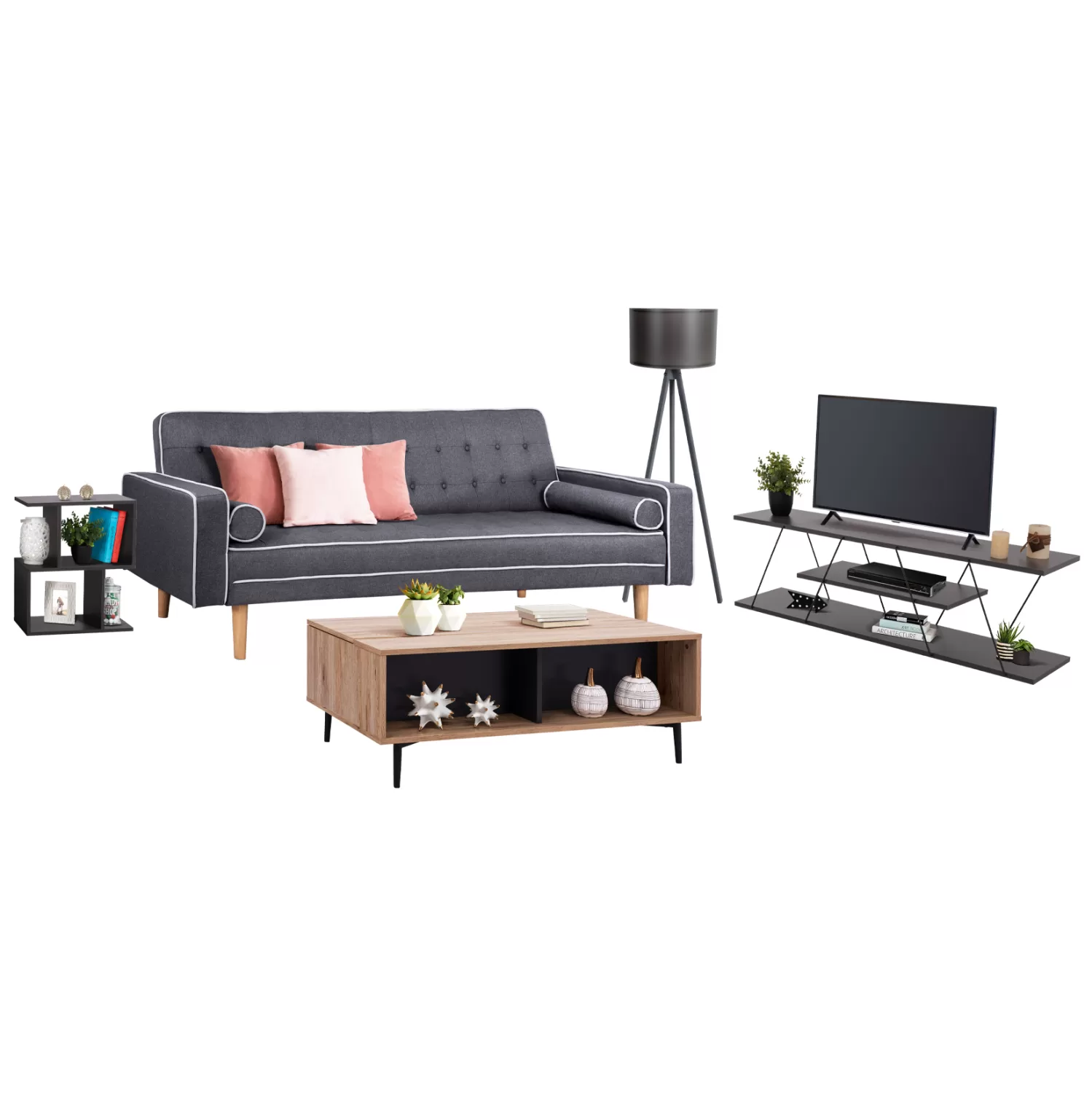 Αυτό το σετ περιλαμβάνει καναπέ-κρεβάτι, τραπέζι σαλονιού, βοηθητικό τραπέζι, έπιπλο τηλεόρασης, και φωτιστικό δαπέδου!