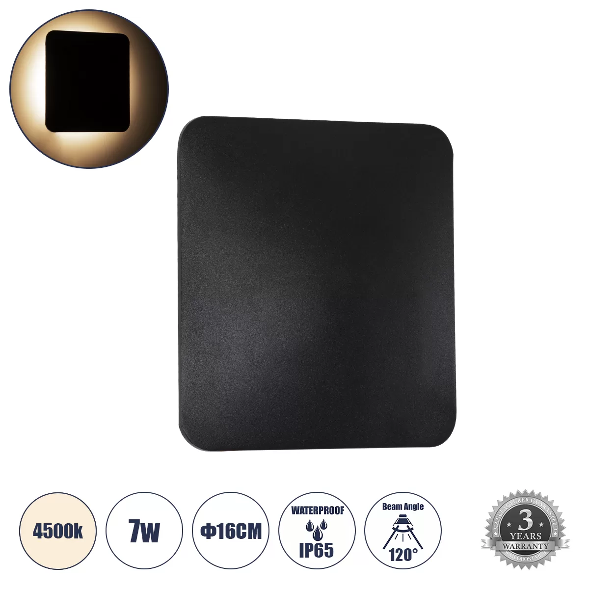 Το σώμα του φωτιστικού, σε μαύρο ματ χρώμα, είναι κατασκευασμένο από αλουμίνιο, προσφέροντας αντοχή και μια μοντέρνα εμφάνιση που ταιριάζει σε κάθε στυλ διακόσμησης. Με διαστάσεις Μ16 x Π5 x Υ16 εκατοστά, είναι συμπαγές και ευκολοτοποθέτητο, ιδανικό για βεράντες, μπαλκόνια, κήπους, διαδρόμους ή βιομηχανικούς χώρους.