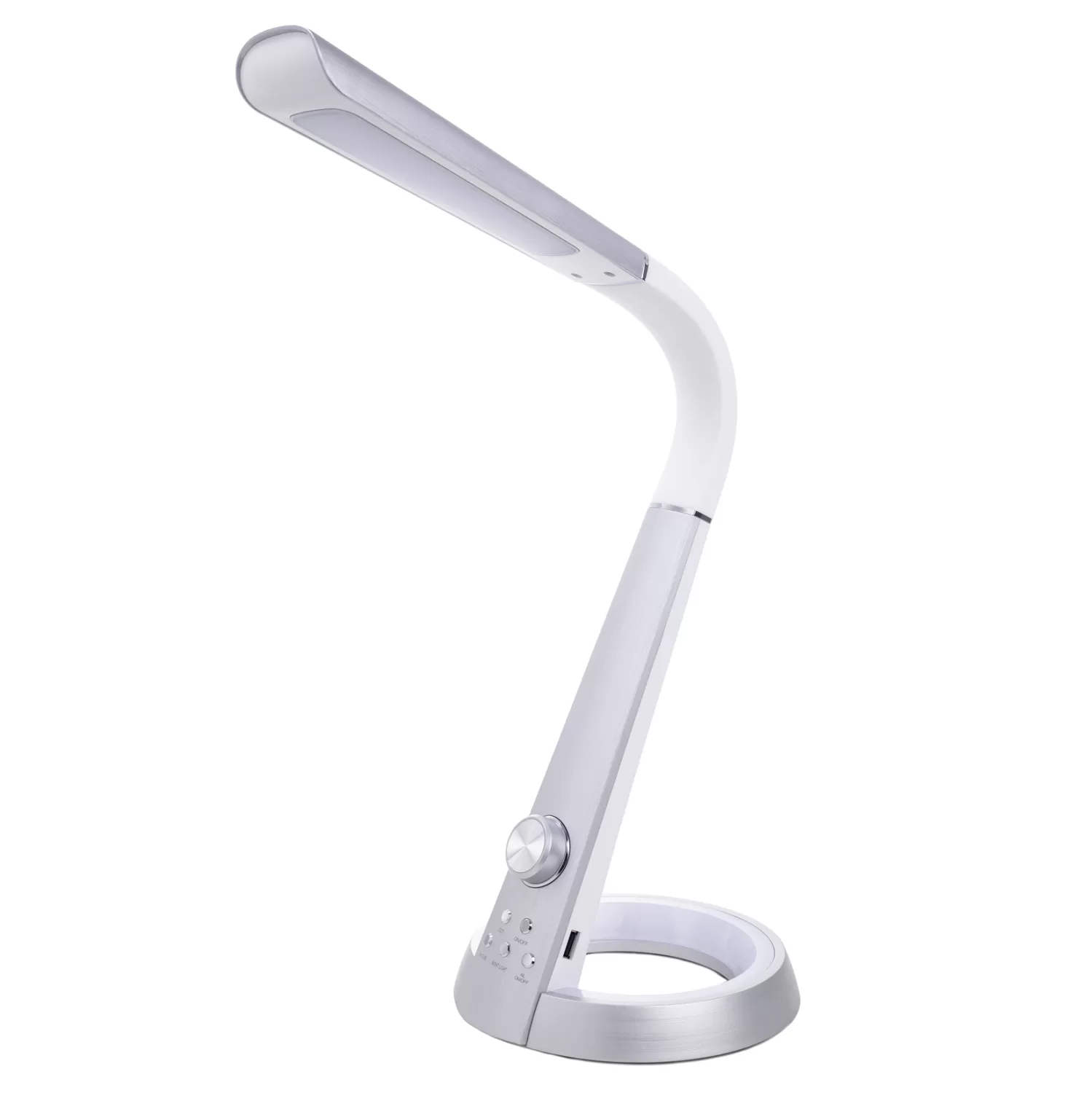 Το φωτιστικό γραφείου LED Blain Pro διαθέτει στρογγυλή βάση και κομψό βραχίονα από ανθεκτικό ABS σε ασημί χρώμα. Ο εύχρηστος περιστροφικός μοχλός στην κεντρική κολώνα σας δίνει άμεση πρόσβαση στις τρεις προκαθορισμένες θερμοκρασίες χρώματος (3000Κ, 4000Κ, 6500Κ) και στη συνεχή ρύθμιση φωτεινότητας (stepless dimming), ώστε να διαμορφώνετε το φως για λεπτομερείς εργασίες ή χαλάρωση. Η βάση του περιλαμβάνει έναν διακοσμητικό “ατμοσφαιρικό” φωτισμό με 4 αποχρώσεις, ενώ ο βραχίονας με άρθρωση υψηλής ποιότητας σιλικόνης επιτρέπει πλήρη κίνηση 360 μοιρών για ακριβή κατεύθυνση του φωτός.
