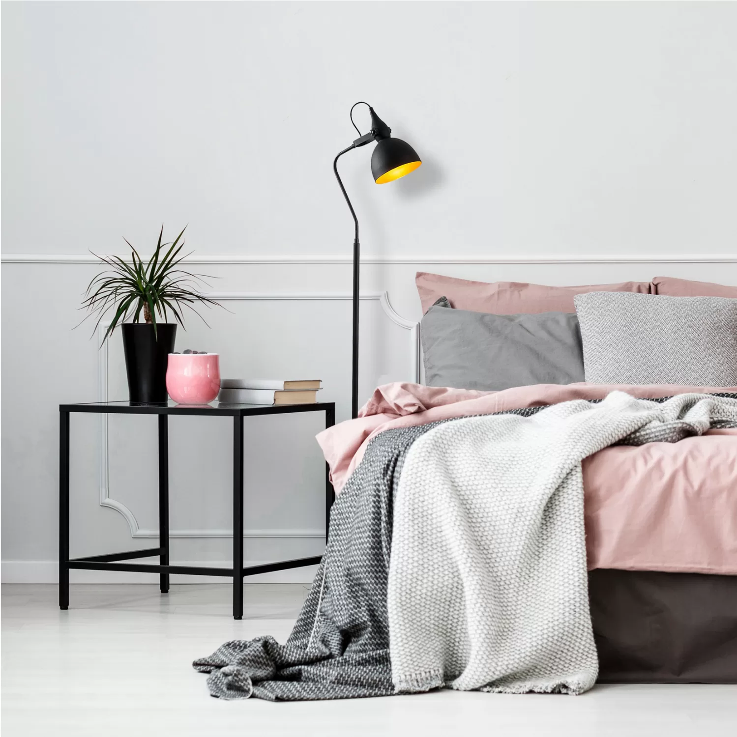 Επιλέξτε ένα μοντέρνο φωτιστικό δαπέδου μεταλλικό μαύρο που συνδυάζει αισθητική με αντοχή. Ο σκελετός από μέταλλο σε διακριτικό μαύρο χρώμα και το καπέλο σε διχρωμία μαύρου με χρυσό εσωτερικό προσδίδουν μια αίσθηση σύγχρονης πολυτέλειας σε κάθε χώρο.