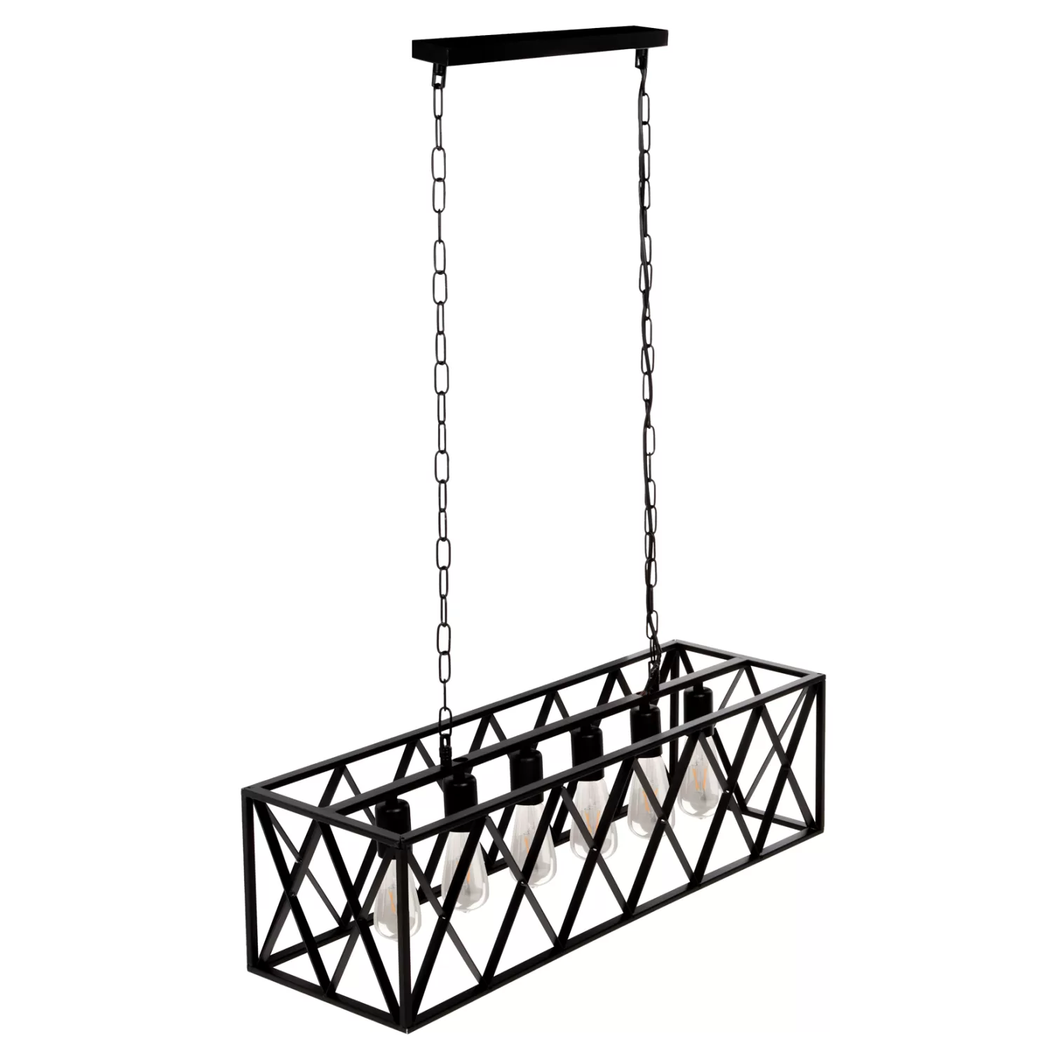 HΜ4128—Ανακαλύψτε τα νέα φωτιστικά στην γκάμα μας και ολοκληρώστε την διακόσμησή σας. Πρόκειται για ένα φωτιστικό με 6 λάμπες που κρέμεται με αλυσίδες από την βάση της οροφής. Το ορθογώνιο μεταλλικό καπέλο σε ΜΑΥΡΟ χρώμα δεν εμποδίζει καθόλου το φως να φτάσει σε κάθε γωνιά, και είναι η επιτομή του μοντέρνου design στα φωτιστικά οροφής.