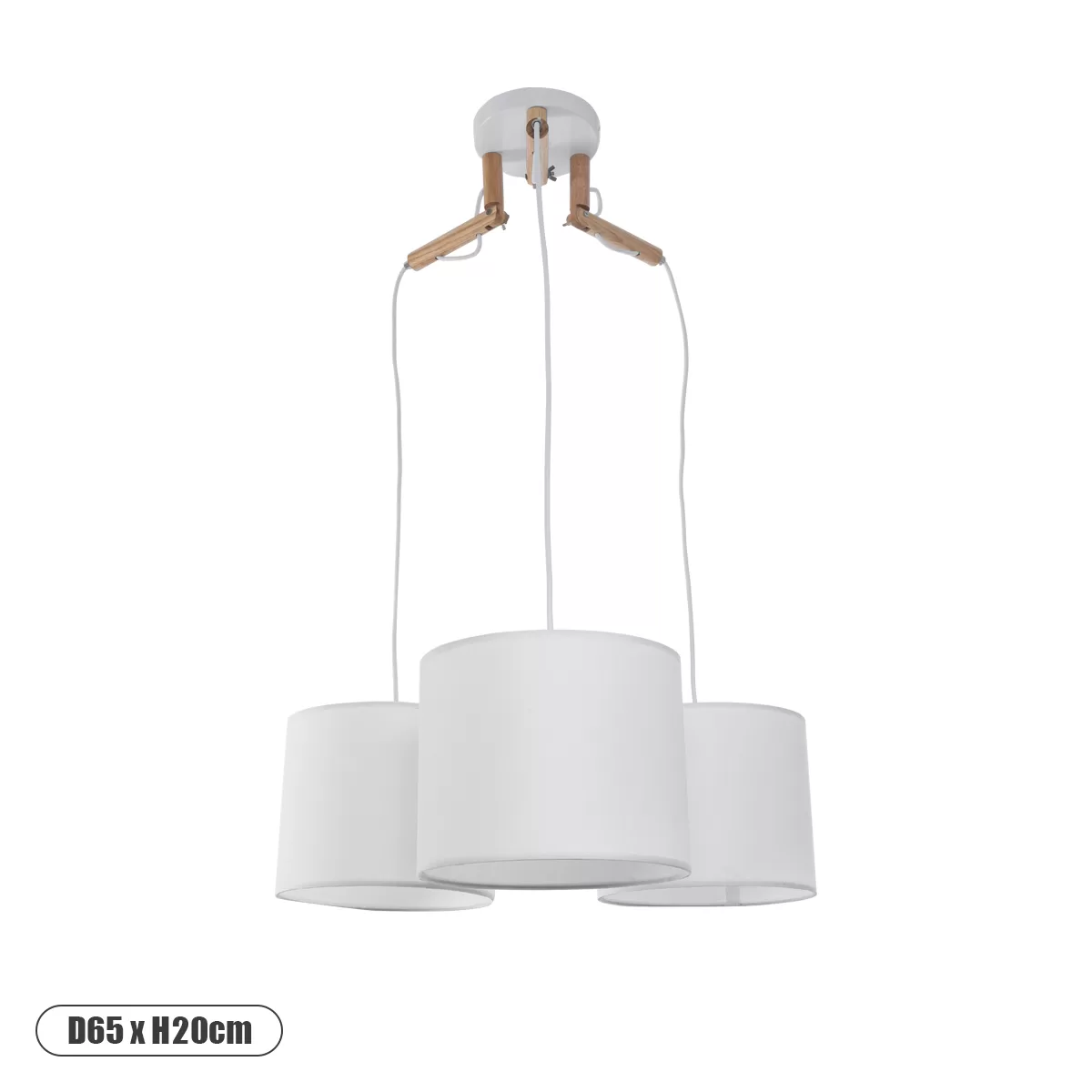 Το φωτιστικό διαθέτει τρία υφασμάτινα καπέλα, τα οποία εξασφαλίζουν ένα μαλακό και διάχυτο φως, ιδανικό για το σαλόνι, την τραπεζαρία ή την κουζίνα. Η λεπτομέρεια του ξύλινου πλαισίου προσθέτει μια αισθητική ζεστασιά και αντίθεση, δημιουργώντας έναν οπτικά ενδιαφέροντα συνδυασμό υφών. Η ηλεκτροστατική βαφή σε λευκό χρώμα εγγυάται αντοχή και εύκολο καθάρισμα.